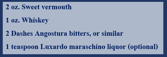 There is nothing special to making this drink, you just invert the ratios of whiskey to vermouth in the traditional Manhattan. So instead of 2 ounces of whiskey and 1 ounce of vermouth I pour 2 ounces of vermouth and just 1 ounce of whiskey and dress it up as you normally would with 2 dashes of Angostora bitters, or similar.